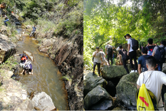下車后,打開行李廂就看到了教練準備的午餐需要的食材,雞鴨魚肉,新鮮蔬菜樣樣俱全,大家都打開了背包自覺的扛起了背負食材的重任。流楓溪是一條經典但非常規的戶外路線,陡峭的溪谷,遍布四處的河灘,上山時要求大家溯溪而上。攀爬了將近3個小時,你早已分不清哪些是汗水哪些是溪水,一路上大家四肢并用,食材、鍋具相互傳遞,鞋子早已經濕了無數次。中途有三三兩兩的小伙伴累趴了,停下休息。但大家相互協作,相互扶持,所幸全員登頂。陽光總在風雨后,登頂后站在高處,仰望藍天白云,遠山如黛,風吹過帶來絲絲涼意,令人更覺溯溪的難能可貴。