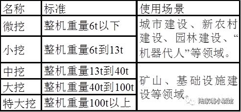目前國內外市場上的挖掘機絕大部分為單斗液壓挖掘機,根據中國工程機械工業協會挖掘機分會分類標準,單斗液壓挖掘機按照整機重量分類: