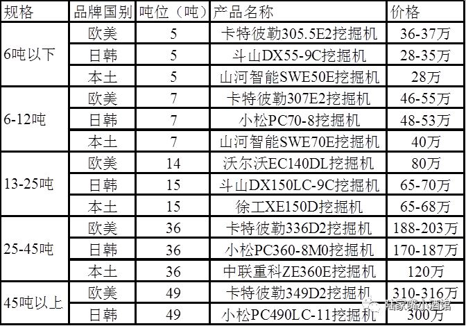 整體上從價格上來說,歐美品牌高于日韓品牌高于本土品牌,但是日韓和本土品牌在25噸以下規格的中小挖中差距已經不大。