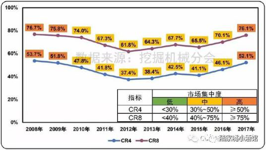 2008年“四萬億”投資的拉動下,大量資本投資挖掘機械市場,主機廠商規模的增加加之“低首付、零首付”等極端信用銷售模式的實施,導致市場秩序惡化,市場集中度大幅下滑。